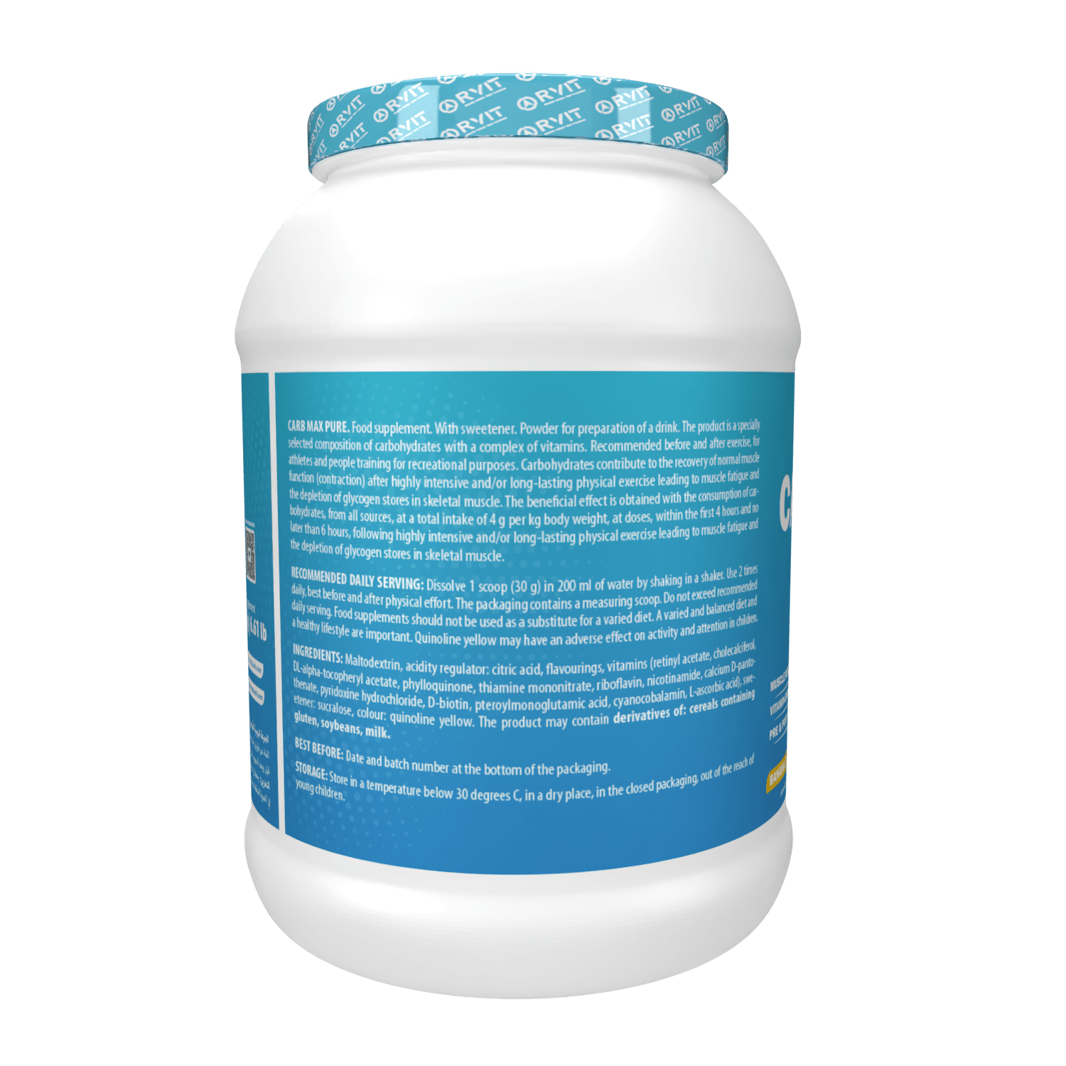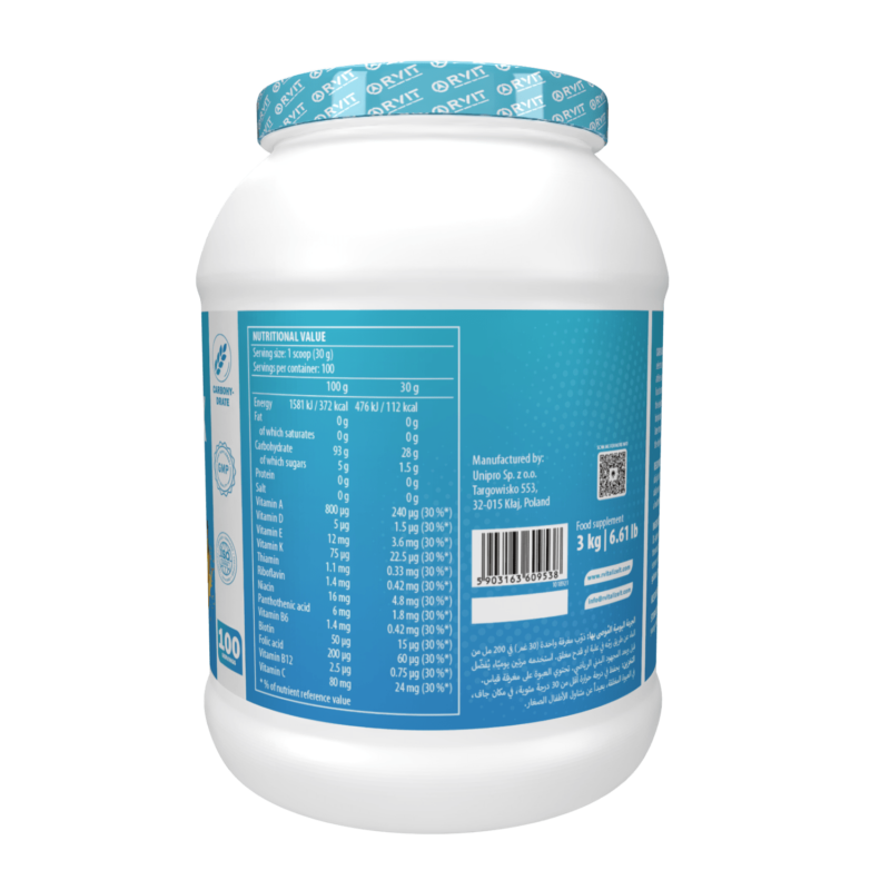 Food supplement. With sweetener. Powder for preparation of a drink. The product is a specially selected composition of carbohydrates with a complex of vitamins. Recommended before and after exercise, for athletes and people training for recreational purposes. Carbohydrates contribute to the recovery of normal muscle function (contraction) after highly intensive and/or long-lasting physical exercise leading to muscle fatigue and the depletion of glycogen stores in skeletal muscle. The beneficial effect is obtained with the consumption of carbohydrates, from all sources, at a total intake of 4 g per kg body weight, at doses, within the first 4 hours and no later than 6 hours, following highly intensive and/or long-lasting physical exercise leading to muscle fatigue and the depletion of glycogen stores in skeletal muscle.