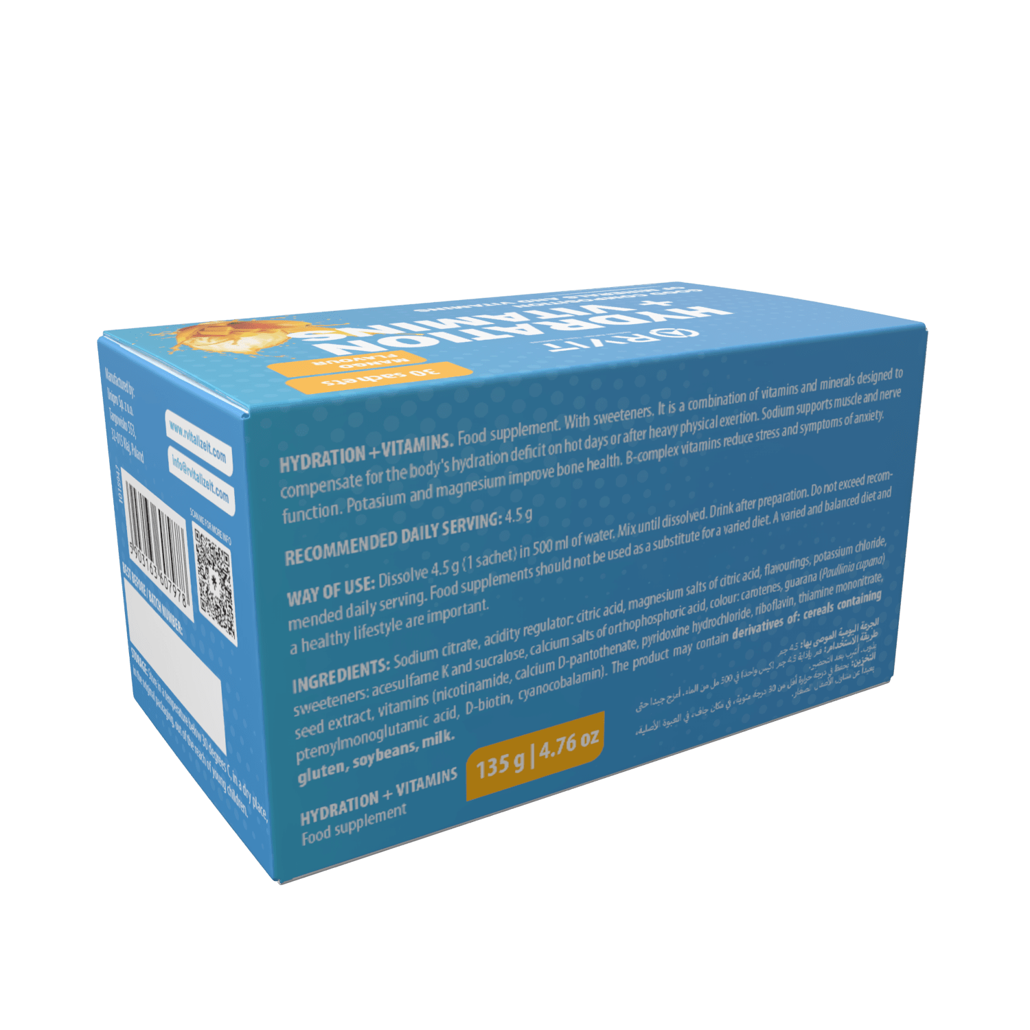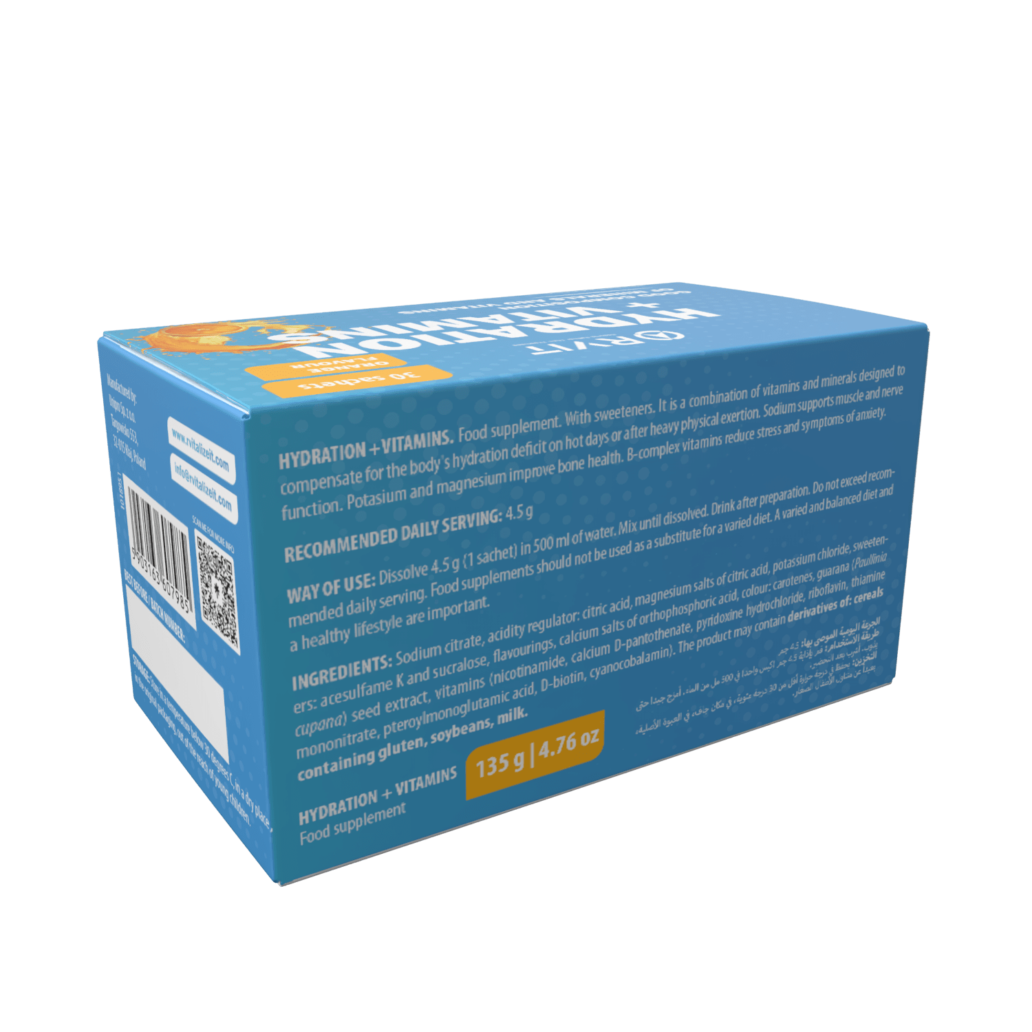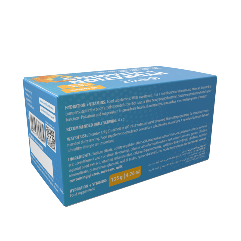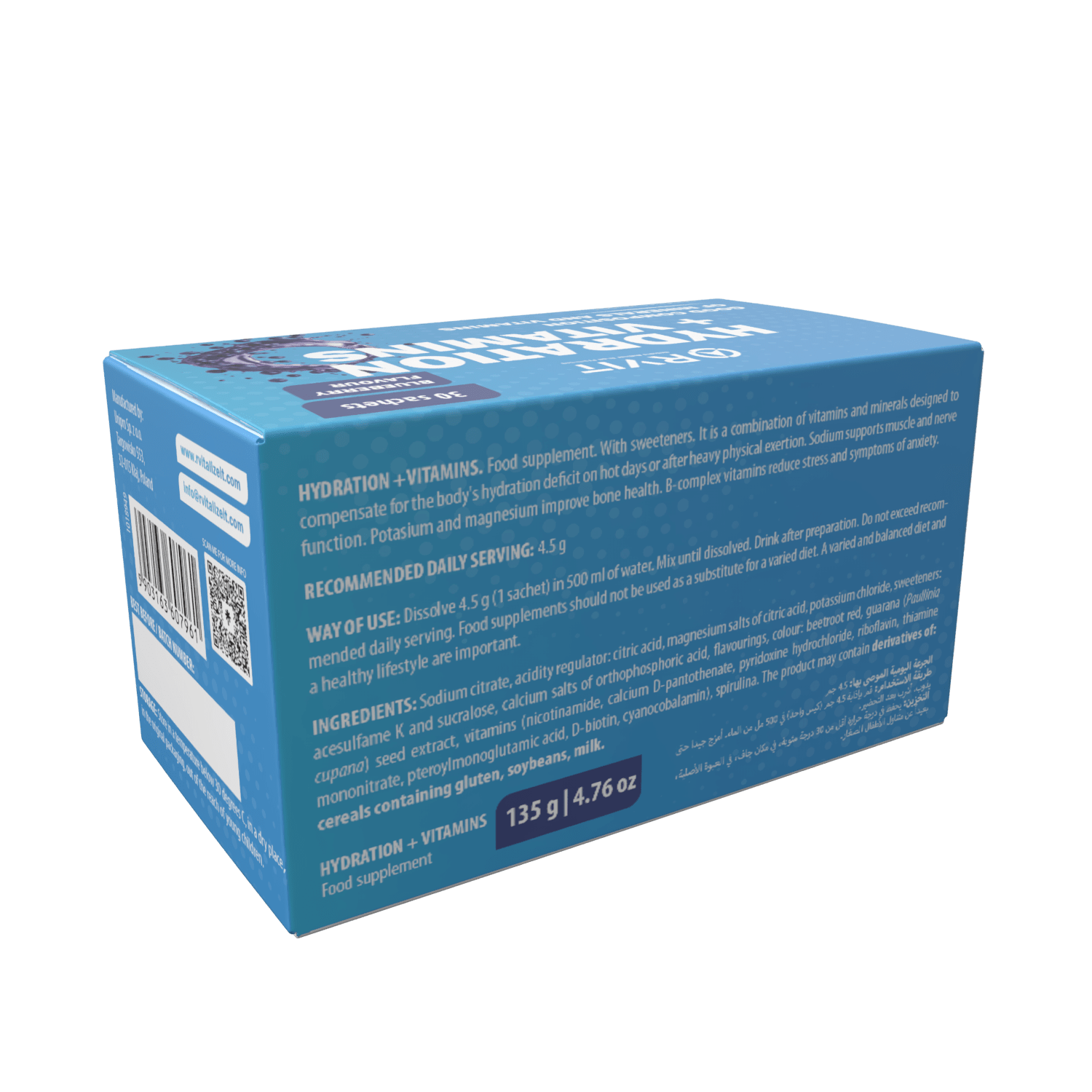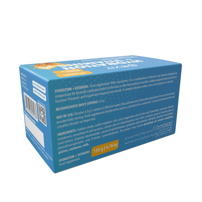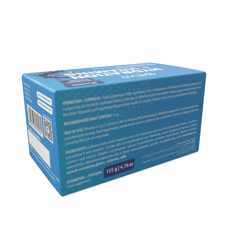 HYDRATION + VITAMINS. Food supplement. With sweeteners. It is a combination of vitamins and minerals designed to compensate for the body’s hydration deficit on hot days or after heavy physical exertion. Sodium supports muscle and nerve function. Potasium and magnesium improve bone health. B-complex vitamins reduce stress and symptoms of anxiety.