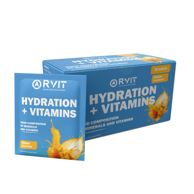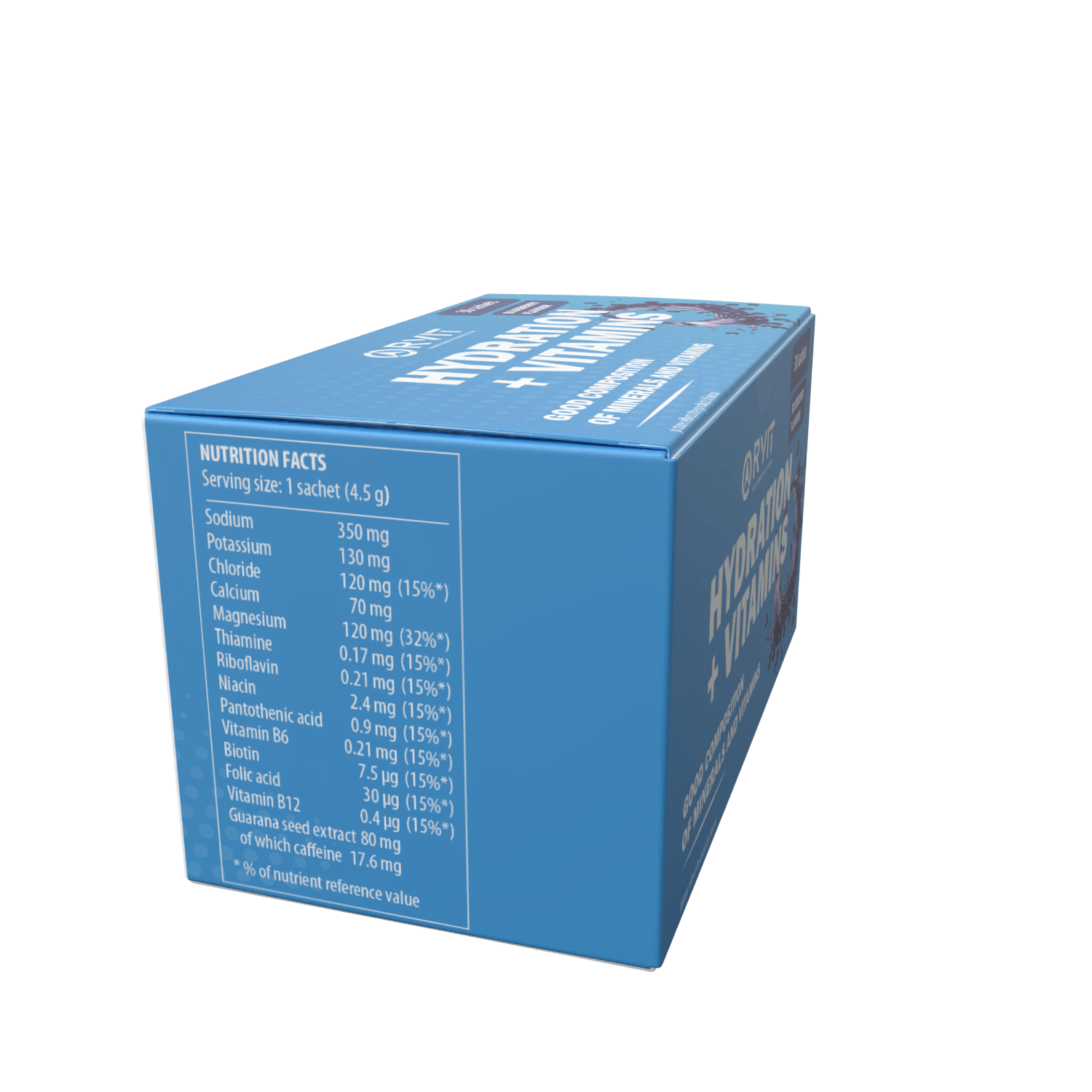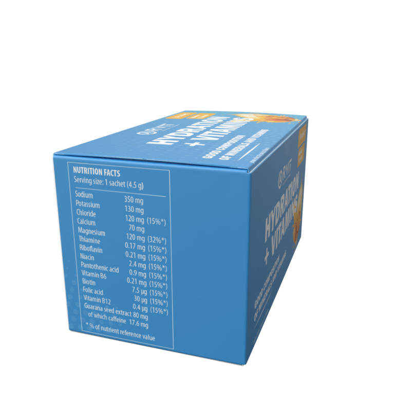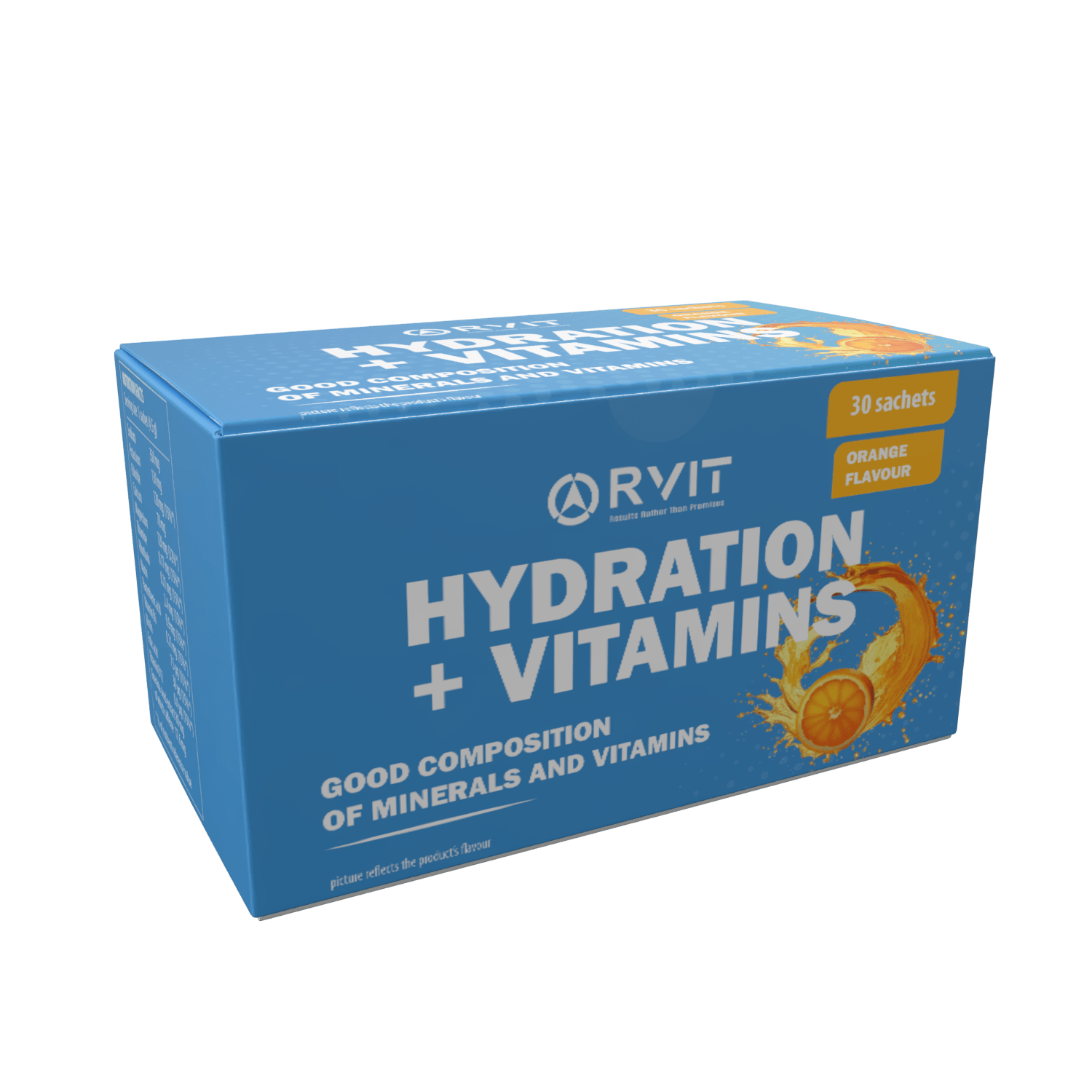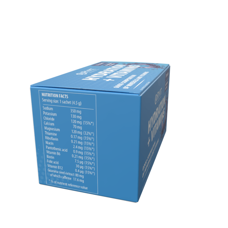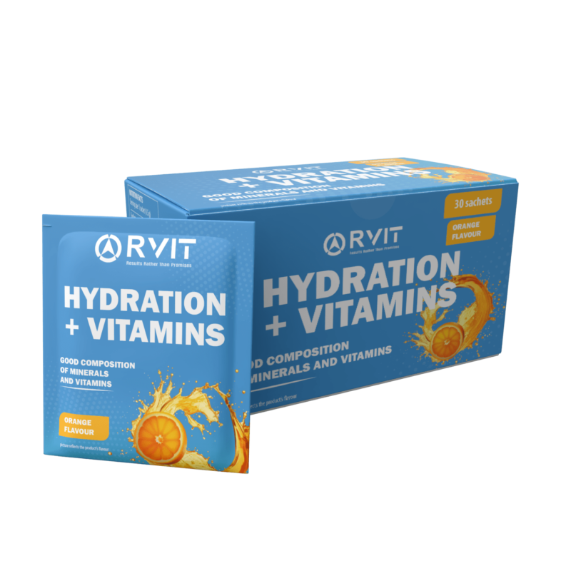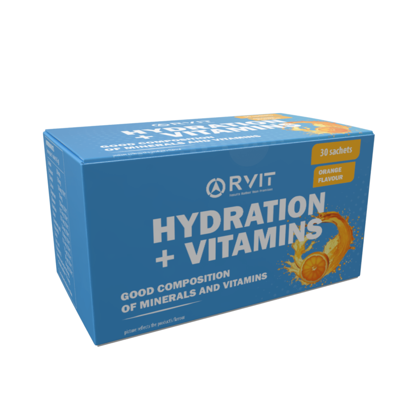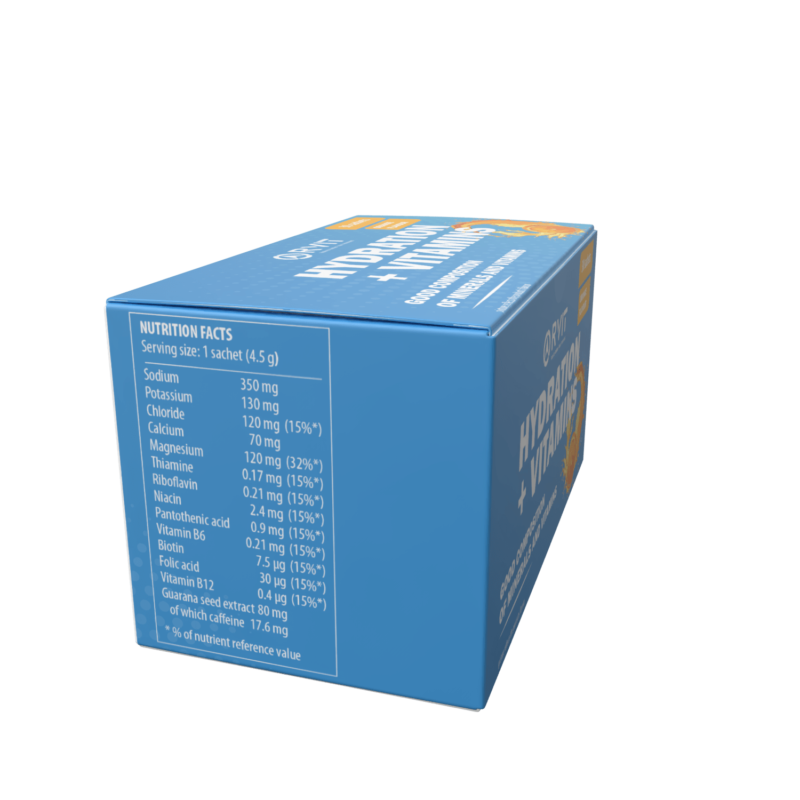 HYDRATION + VITAMINS. Food supplement. With sweeteners. It is a combination of vitamins and minerals designed to compensate for the body’s hydration deficit on hot days or after heavy physical exertion. Sodium supports muscle and nerve function. Potasium and magnesium improve bone health. B-complex vitamins reduce stress and symptoms of anxiety.