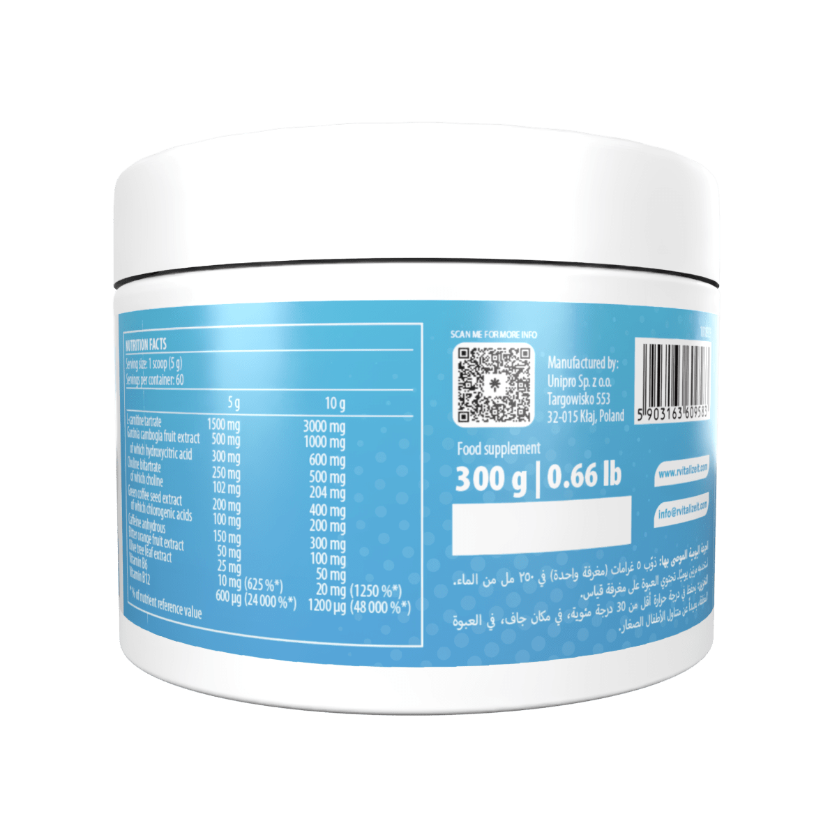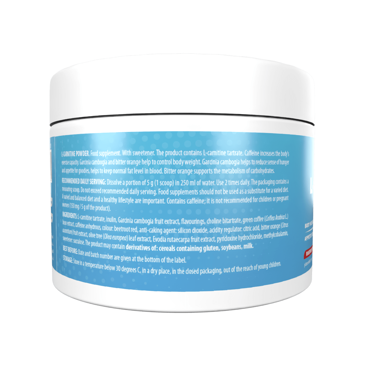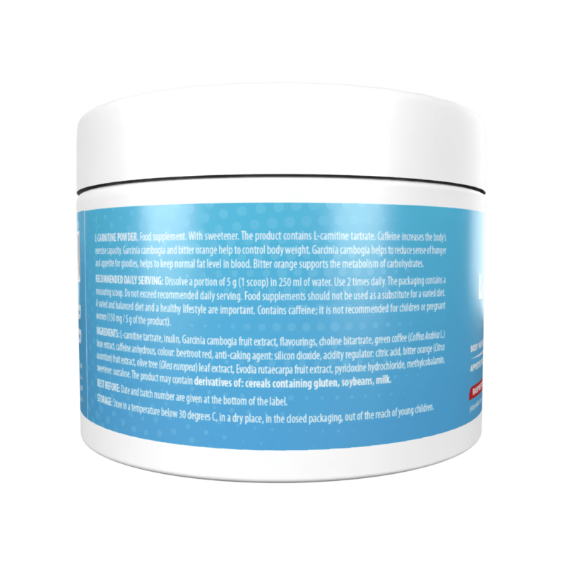 L-CARNITINE POWDER. Food supplement. With sweetener. The product contains L-carnitine tartrate. Caffeine increases the body’s exercise capacity. Garcinia cambogia and bitter orange help to control body weight. Garcinia cambogia helps to reduce sense of hunger and appetite for goodies, helps to keep normal fat level in blood. Bitter orange supports the metabolism of carbohydrates.