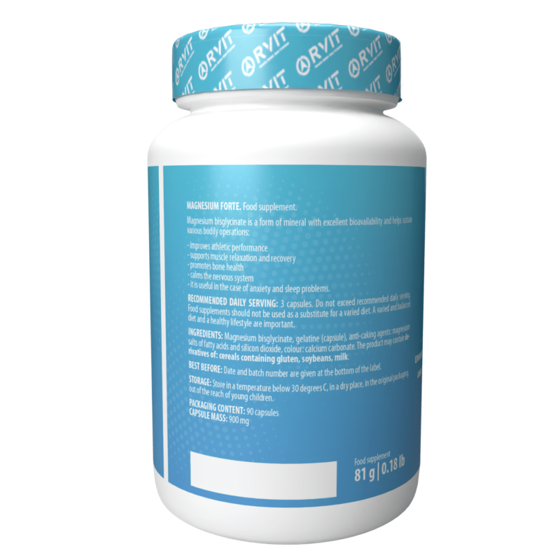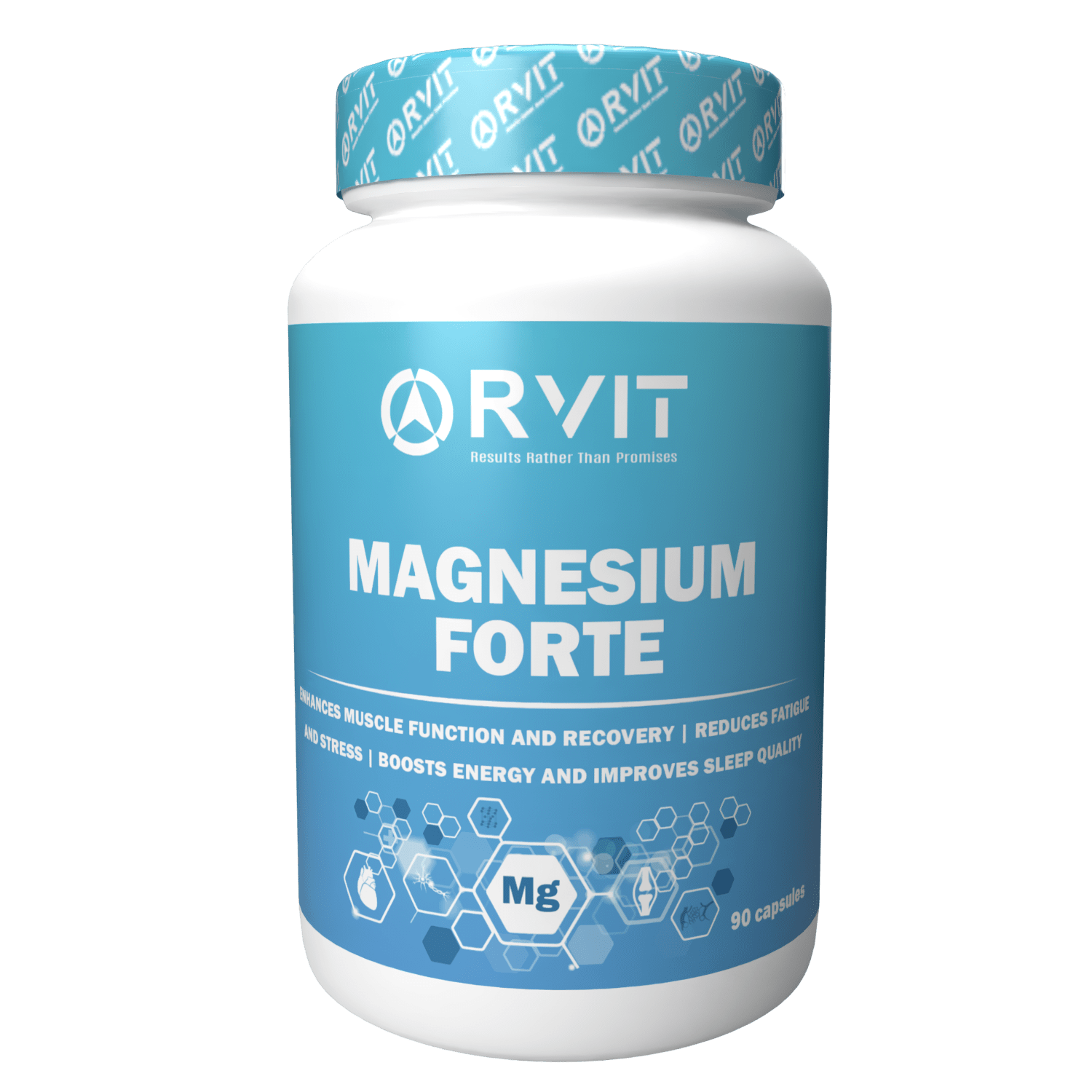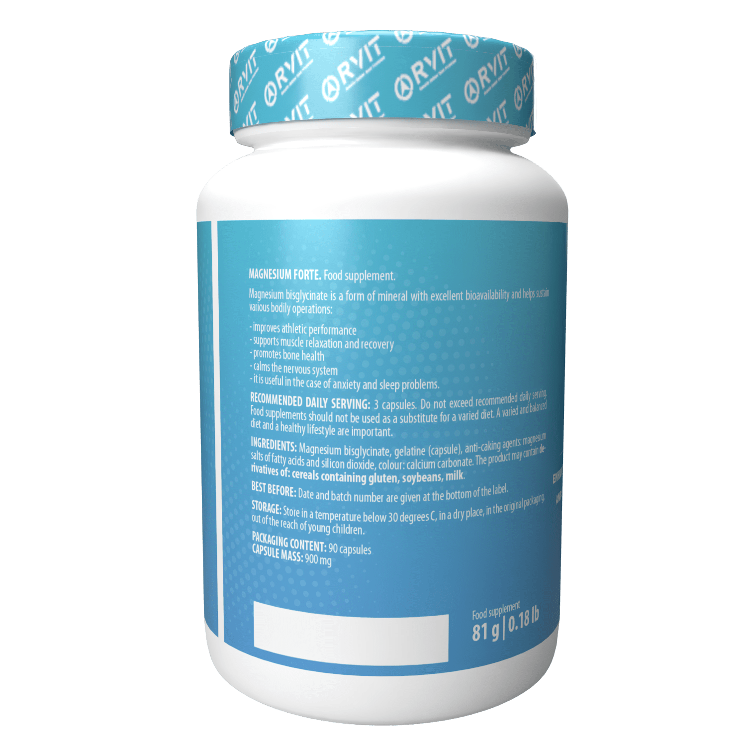 Magnesium Forte is a food supplement providing highly bioavailable magnesium bisglycinate to support muscle relaxation, recovery, and overall physical performance. It contributes to bone health, helps calm the nervous system, and may aid in reducing anxiety and improving sleep quality, making it ideal for active individuals and those seeking to maintain overall wellness.